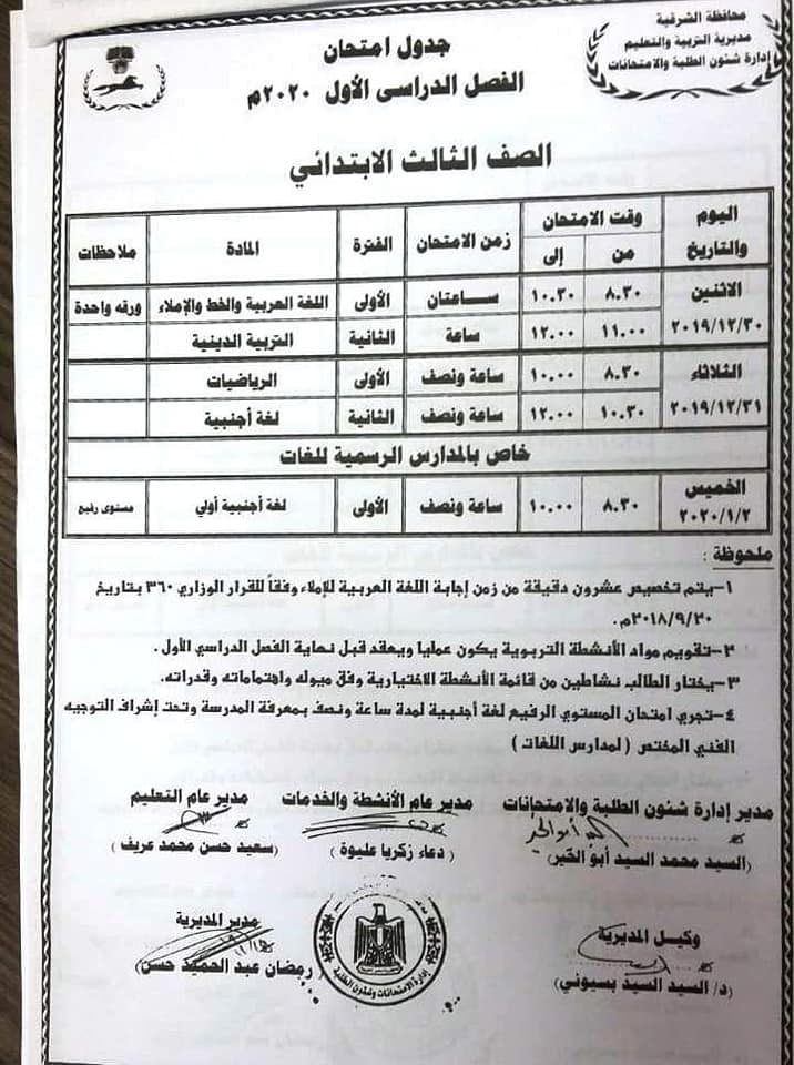 زاد الطالب جداول امتحان المرحلة الابتدائية الفصل الدراسى الأول 2019 2020 محافظة الشرقية
